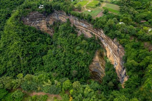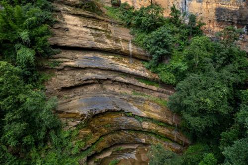 จุดถ่ายรูปสุดปัง แนวหน้าผาหินทรายสลับซับซ้อน ตัดกับท้องฟ้าและทิวเขาเขียวขจี